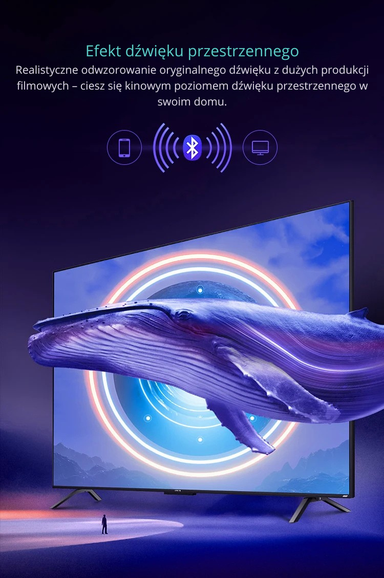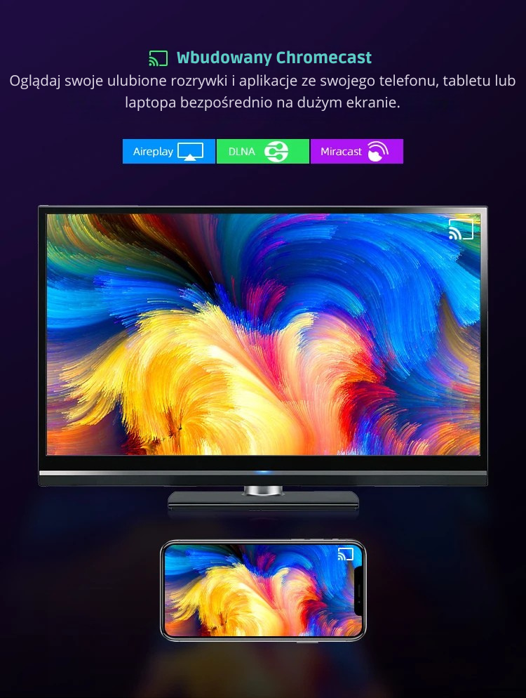 Dzięki wbudowanemu Chromecastowi łatwo przesyłasz filmy, muzykę i ulubione aplikacje prosto z telefonu, tabletu lub laptopa na ekran telewizora. Bez dodatkowych urządzeń i skomplikowanych konfiguracji – po prostu wybierz, co chcesz oglądać, i ciesz się rozrywką w dużym formacie.